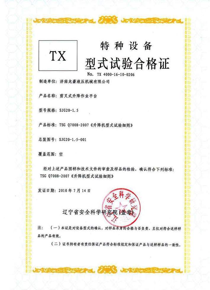 固定剪叉升降平臺合格證